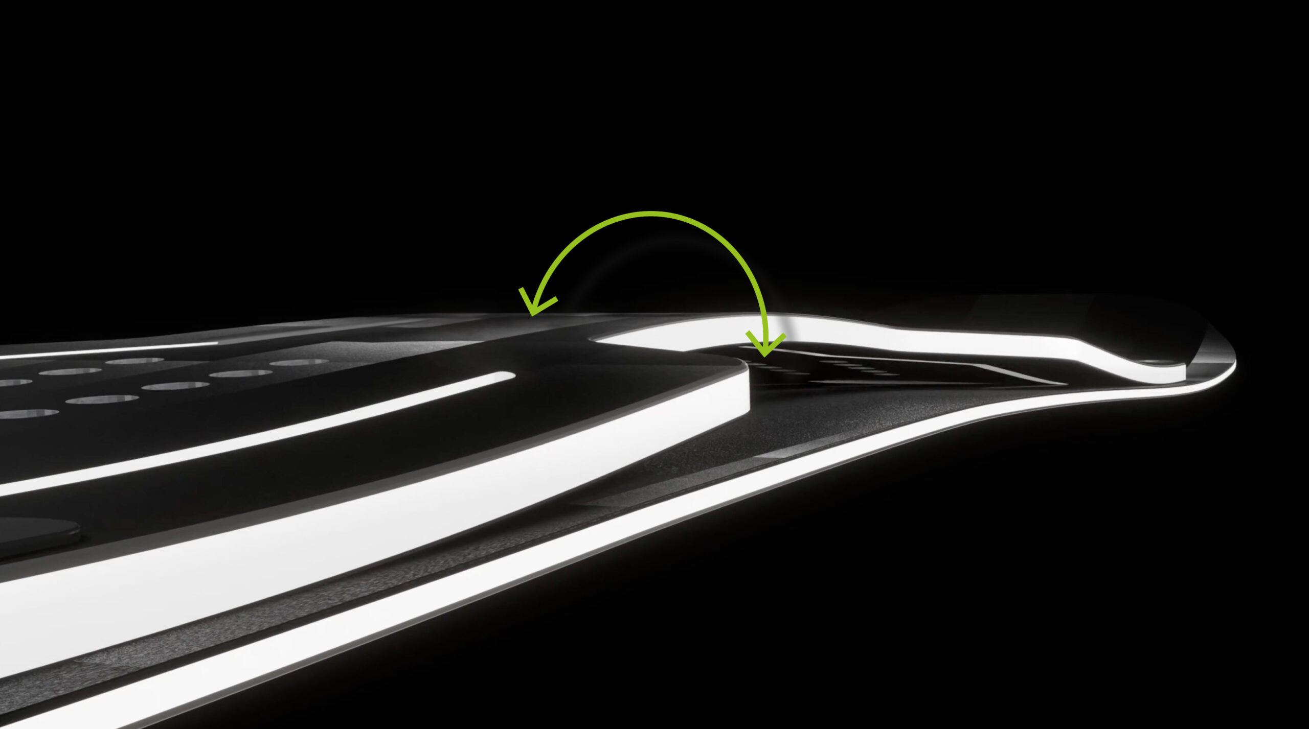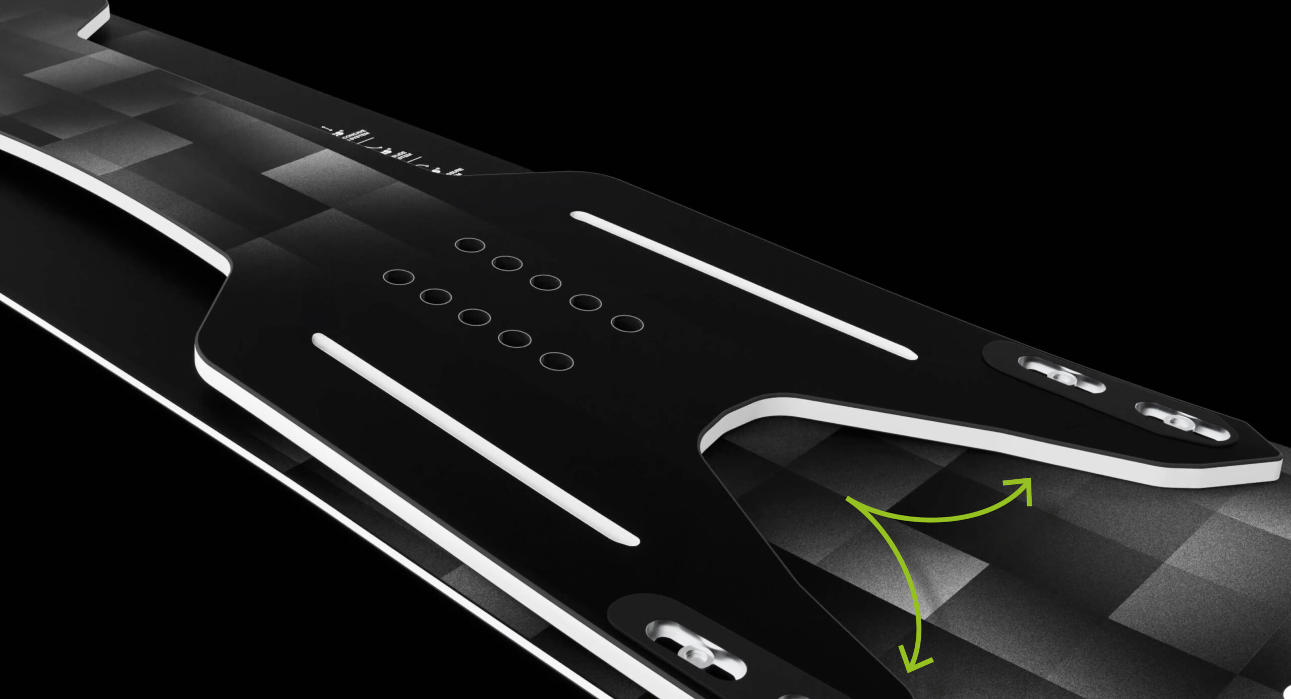 Der Bow ist hinten mit vier gleitenden und vorne mit fixierenden Schrauben auf dem Board montiert. Er muss gleiten, damit ein gewisses Ausweichen möglich ist, um den konkaven Bow in die gegengesetzte Richtung konvex durchzudrücken. So gleitet der Bow bei jedem Turn minimal und nicht spürbar auf dem Board vor und zurück. Sobald der Rider von einem Schwung in den anderen geht, wird der Bow entlastet und gleitet „wie auf Schienen“ zurück.